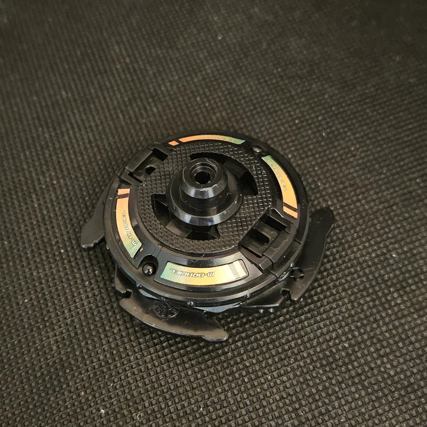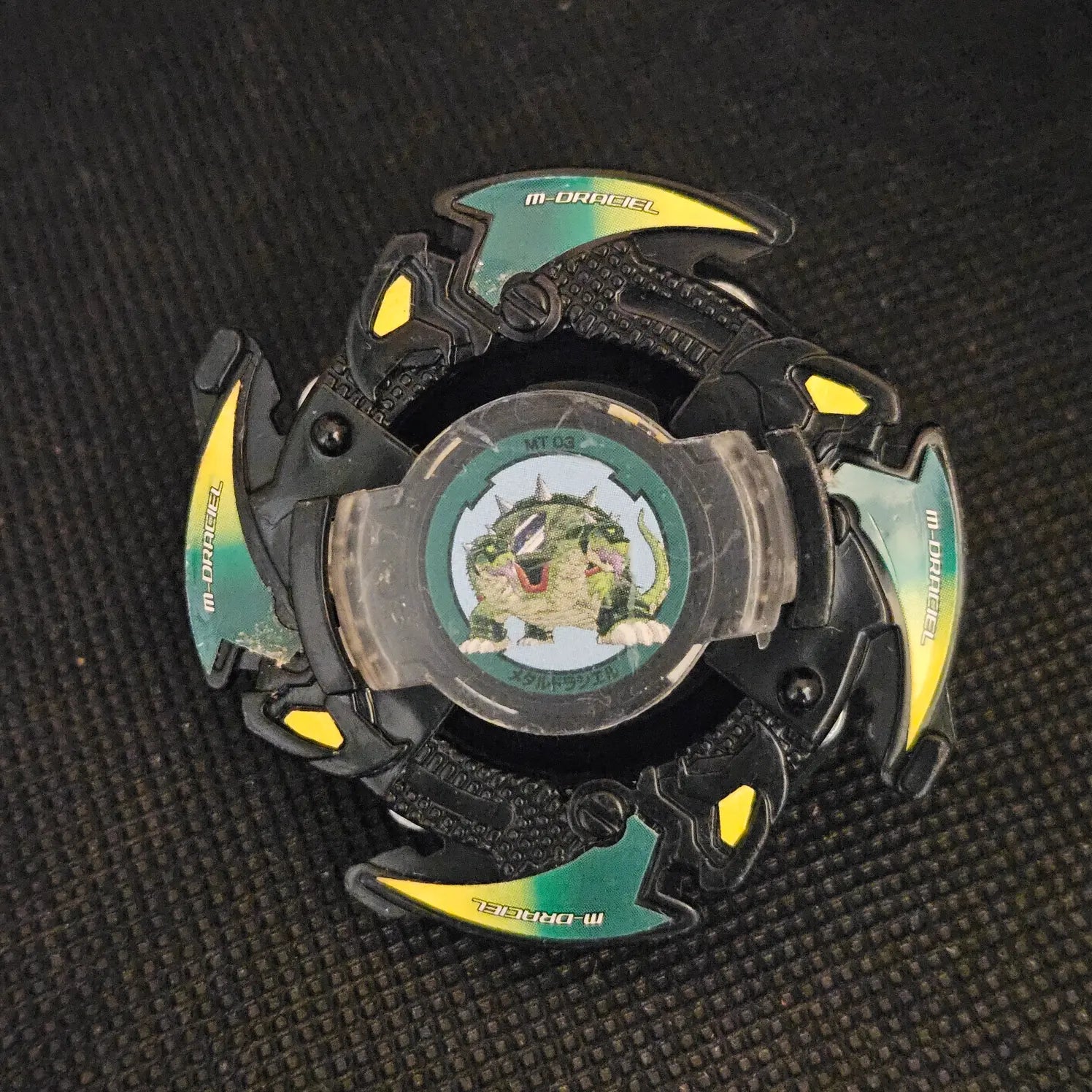 Note: Base metal tip is missing.  Metal Draciel is a Defense-type Beyblade known for its resilience and strategic play. This variant of Draciel closely mirrors the design and performance of Master Dranzer, differing primarily in color coding. Its robust construction offers superior stamina and defense, making it ideal for players who prioritize durability and control in battles.